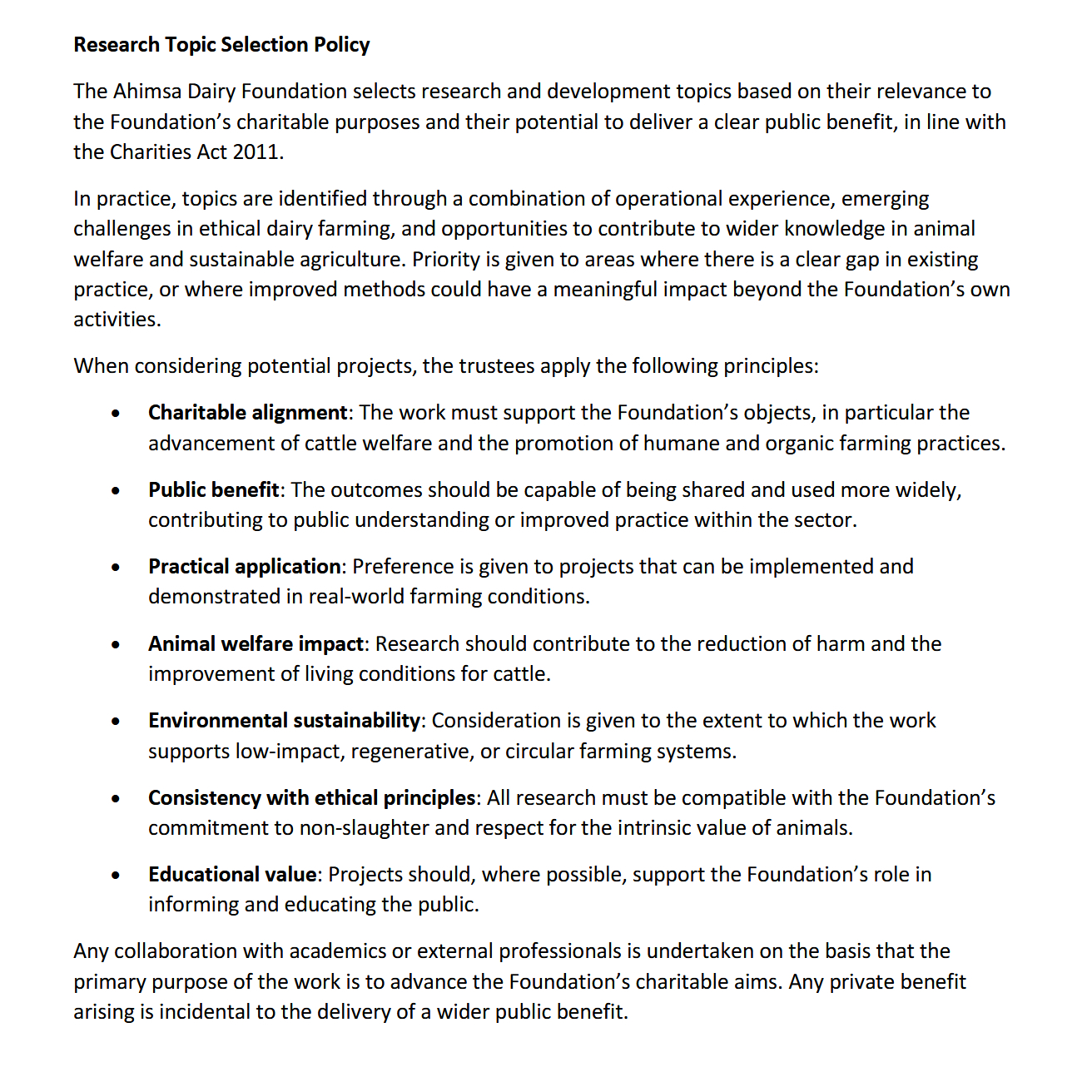 The Ahimsa Dairy Foundation selects research and development topics based on their relevance to the Foundation’s charitable purposes and their potential to deliver a clear public benefit, in line with the Charities Act 2011.
